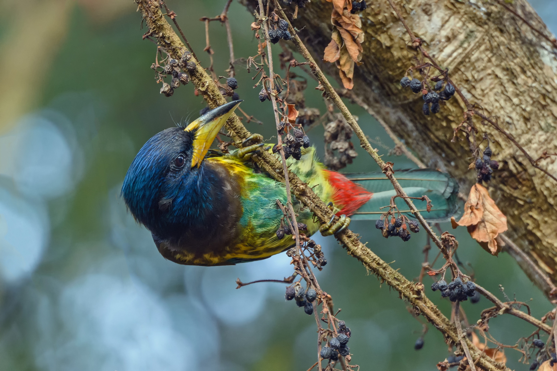 The great barbet is a resident breeder in the lower-to-middle altitudes of the Himalayas, ranging across northern Pakistan, India, Nepal and Bhutan, Bangladesh and some parts of Southeast Asia, as far away as Laos.